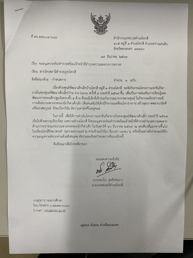 20 ธ.ค.2567 เวลา 07.30 น. โดยการอำนวยการของ พ.ต.ท.ธวัชชัย มุริจันทร์ สว.สภ.โคกสี มอบหมายให้ ร.ต.ท.พชร ศรีโคตา รอง สว (ป.) สภ.โคกสี ชุดปฏิบัติการสายตรวจจราจร อำนวยความสะดวกด้านการจราจร นำขบวนพาเหรด กีฬา ของศูนย์พัฒนาเด็กเล็ก บ้านโคกสี, หนองไผ่ และสามแยก เทศบาลตำบลโคกสี