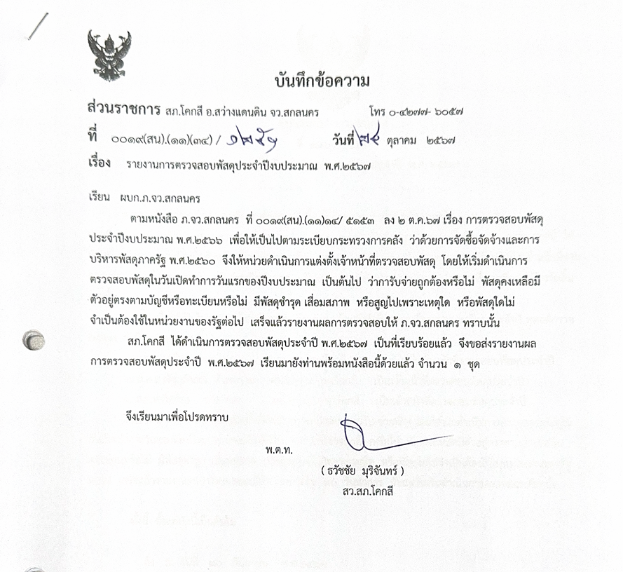 รายงานผลการปฏิบัติเกี่ยวกับการจัดการทรัพย์สินของทางราชการ ของบริจาค การจัดเก็บของกลาง เดือน ต.ค.67