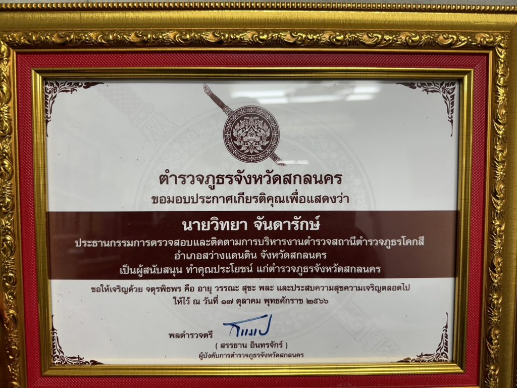 (19 ต.ค 66) ที่ลานฝึกอินทรจักร์ ด้านหน้าอาคารที่ทำการตำรวจภูธรจังหวัดสกลนคร พล.ต.ต.สรรธาน อินทรจักร์ ผู้บังคับการตำรวจภูธรจังหวัดสกลนคร เป็นประธานในพิธีจัดงาน “วันตำรวจ” ประจำปี 2566 เพื่อแสดงถึงความมุ่งมั่น ทุ่มเท เสียสละ อุทิศตนเพื่อระงับทุกข์และบำรุงสุขให้กับประชาชาชน โดยมีนายชานน วาสิกศิริ รองผู้ว่าราชการจังหวัดสกลนคร รักษาราชการทานแทนผู้ว่าราชการจังหวัดสกลนคร หัวหน้าส่วนราชการ ศาล ทหาร ตำรวจ และภาคเอกชน เข้าร่วมงาน ทั้งนี้มี รองผู้บังคับการตำรวจภูธรจังหวัดสกลนคร แม่บ้านตำรวจภูธรจังหวัดสกลนคร คณะกรรมการตรวจสอบและติดตามการบริหารงานตำรวจ (กต.ตร) พร้อมด้วยกำลังพลจากสถานีตำรวจภูธร จังหวัดสกลนคร ทั้ง 18 อำเภอ ร่วมพิธี ซึ่งในวันนี้ ประธานในพิธีได้มอบโล่ ประกาศนียบัตรให้กับ คณะกรรมการตรวจสอบและติดตามการบริหารงานสถานี(กต.ตร) ของตำรวจทุกแห่งในจังหวัดสกลนคร เพื่อเป็นการเชิดชูเกียรติเป็นบุคคลผู้ทำคุณประโยชน์ให้แก่สำนักงานตำรวจแห่งชาติและตำรวจภูธรจังหวัดสกลนคร